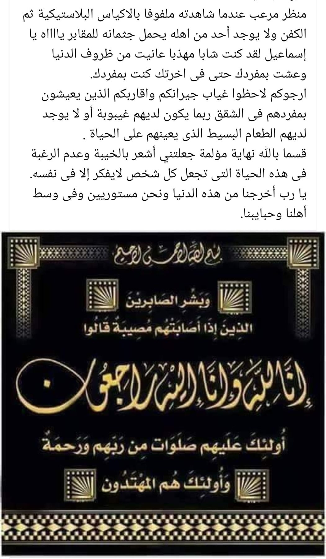 وتابعت أن من قام بتغسيل وتكفين الشاب هم شباب العمارة ودفن دون وجود أحد من أقاربه أو شقيقاته.