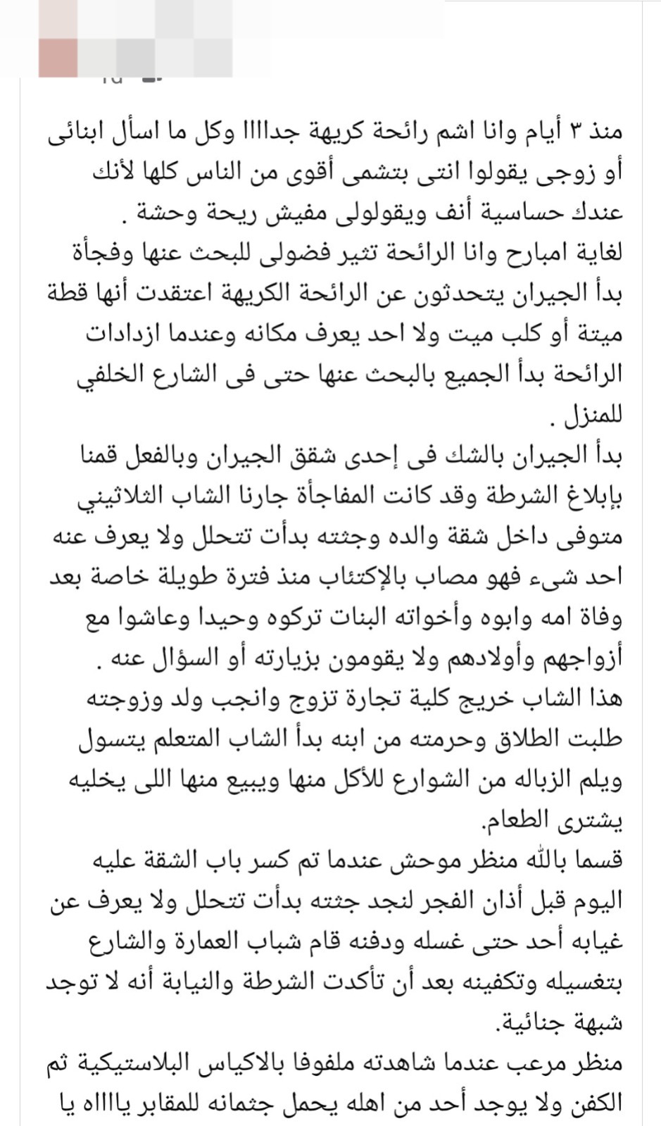 وقالت متداولة الواقعة إنها شمت رائحة كريهة فى محيط عمارتها وبعد يومين بدأ سكان العمارة فى شم نفس الرائحة وبعد بحثهم وجدوا أن هناك شقة فى العمارة بها شاب متوفي وحيدا داخل شقته وفى حالة تعفن ولا يسأل عنه أحد من شقيقاته بعد وفاة والديه".
