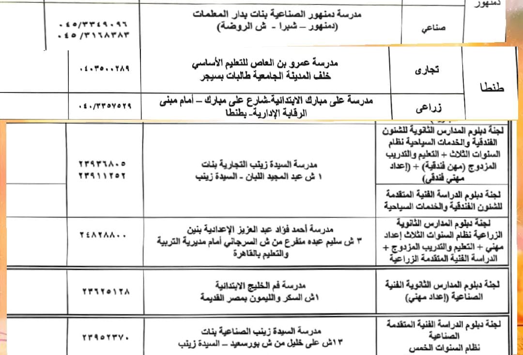 أما الدبلومات الخاصة بالفندقة بكل أنواعه، بمدرسة السيد زينب التجارية بنات" 1 شارع عبدالمجيد اللبان، بالسيدة زينب بالقاهرة، ودبلوم المدارس الثانوية الزراعية" إعداد مهني"، والتعليم المزدوج والدراسة الفنية المتقدمة الزراعية، بمدرسة أحمد فؤاد عبد العزيز الإعدادية بنين" 3 شارع سليم عبده متفرع من شارع السرجاني أمام مديرية التربية والتعليم بالقاهرة، و دبلوم الدراسة الفنية المتقدمة الصناعية نظام ال5 سنوات، بمدرسة السيدة زينب الصناعية بنات، 13 شارع علي خليل من شارع بور سعيد، بالسيدة زينب، ودبلوم المدارس الثانوية الفنية الصناعية" إعداد مهني"،بمدرسة فم الخليج الابتدائية ب 1 شارع السكر والليمون بمصر القديمة.
