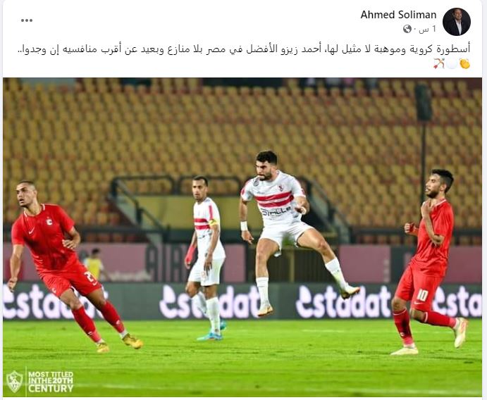 وكتب أحمد سليمان عبر صفحتة الرسمية على "فيس بوك": "أسطورة كروية وموهبة لا مثيل لها، أحمد زيزو الأفضل في مصر بلا منازع وبعيد عن أقرب منافسيه إن وجدوا".