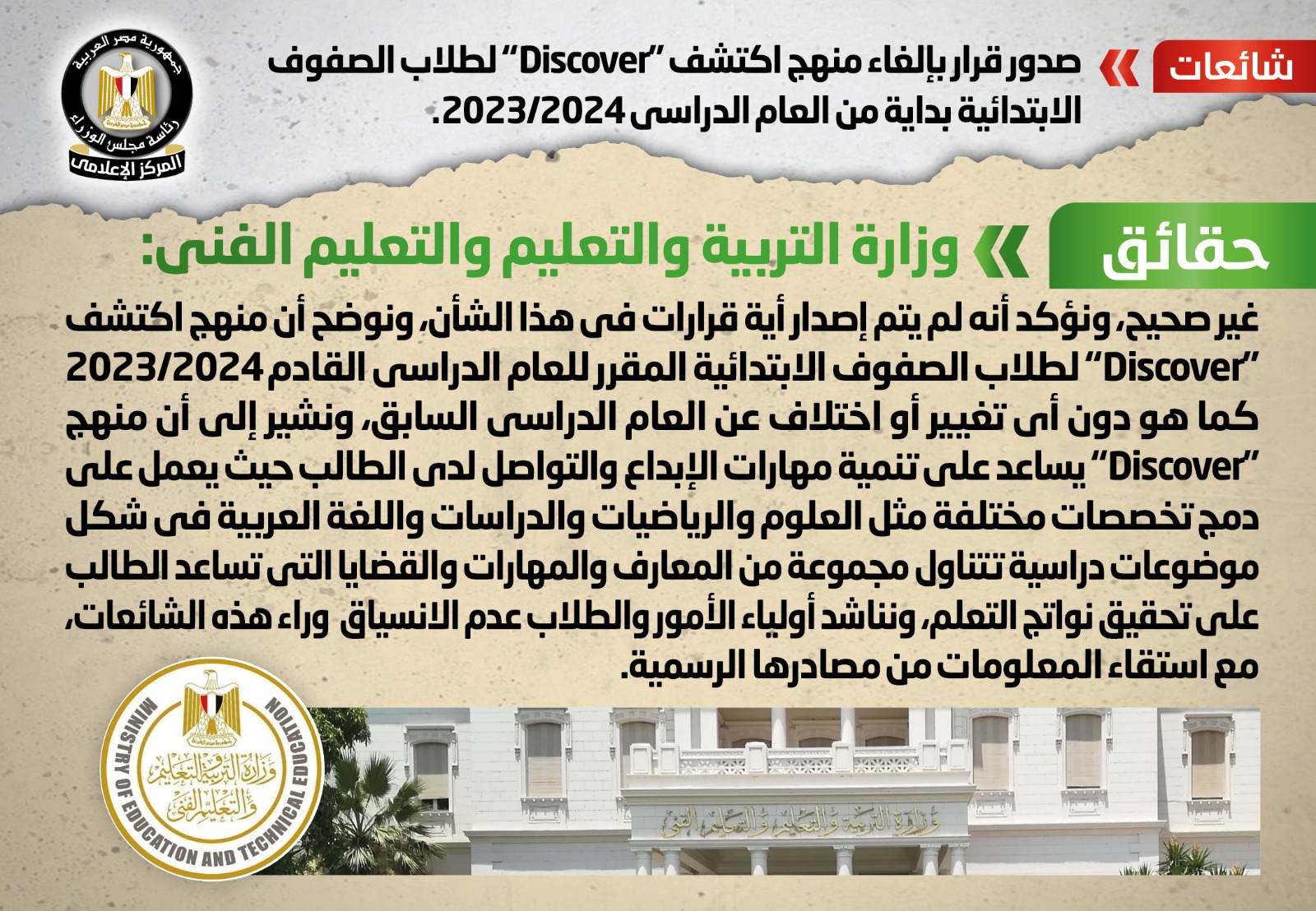 قام المركز الإعلامي لمجلس الوزراء بالتواصل مع وزارة التربية والتعليم والتعليم الفني، والتي نفت تلك الأنباء، مُؤكدةً أنه لا صحة لصدور قرار بإلغاء منهج اكتشف "Discover" لطلاب الصفوف الابتدائية بداية من العام الدراسي 2023/2024، وأنه لم يتم إصدار أية قرارات في هذا الشأن، مُوضحةً أن منهج اكتشف "Discover" لطلاب الصفوف الابتدائية المقرر للعام الدراسي القادم2023/2024 كما هو دون أي تغيير أو اختلاف عن العام الدراسي السابق، مُشيرةً إلى أن منهج" Discover" يساعد على تنمية مهارات الإبداع والتواصل لدى الطالب حيث يعمل على دمج تخصصات مختلفة مثل العلوم والرياضيات والدراسات واللغة العربية في شكل موضوعات دراسية تتناول مجموعة من المعارف والمهارات والقضايا التي تساعد الطالب على تحقيق نواتج التعلم، مُناشدةً أولياء الأمور والطلاب عدم الانسياق وراء هذه الشائعات، مع استقاء المعلومات من مصادرها الرسمية.