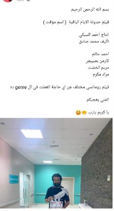 ونشر ماندو العدل، صورة من كواليس الفيلم عبر حسابه الشخصي بموقع التواصل الاجتماعي "فيسبوك"، : بسم الله الرحمن الرحيم فيلم حدوتة الأيام الباقية اسم مؤقت، والعمل من إنتاج أحمد السبكي وتأليف محمد صادق، وبطولة أحمد حاتم، وكارمن بصيبص، ومريم الخشت، ومراد مكرم، فيلم رومانسي مختلف عن أي حاجة اتعملت في الـ genre ده.. أتمنى يعجبكم يا كريم يارب".