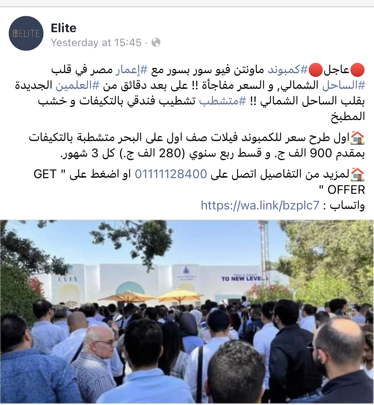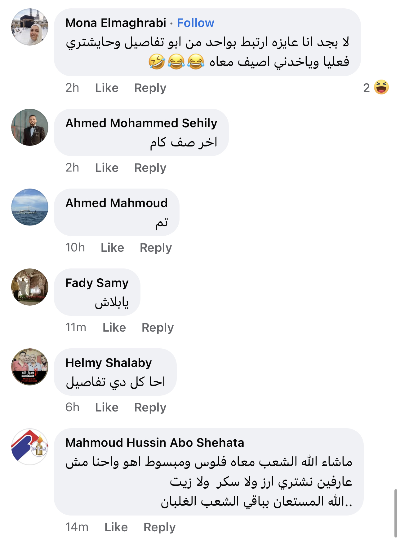 وتضمن الإعلان الذي شهد وجود زحام وطوابير من المواطنين للحجز أن مقدم الحجز 900 ألف جنيه وأقساط ربع سنوية تقدر بـ 250 ألف جنيه، وهو ما أثار السخرية وجاءت التعليقات “ يا بلاش” وعلق أخر “ كل الناس دي معاها فلوس وبتقول تفاصيل” وعلق أخر قائلا" ممكن تفاصيل أجيب المقدم منين".