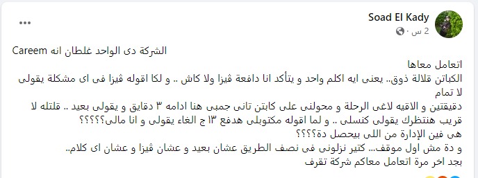 وقالت صاحبة الواقعة" Careem الشركة دى الواحد غلطان انه اتعامل معاها الكباتن قلالة ذوق.. يعنى ايه اكلم واحد و يتأكد انا دافعة ڤيزا ولا كاش .. و لكا اقوله ڤيزا فى اى مشكلة يقولى لا تمام دقيقتين و الاقيه لاغى الرحلة و محولنى على كابتن تانى جمبى هنا ادامه 3 دقايق و يقولى بعيد .. قلتله لا قريب هنتظرك يقولى كنسلى .. و لما اقوله مكتوبلى هدفع 13 ج الغاء يقولى و انا مالى؟؟؟؟؟".