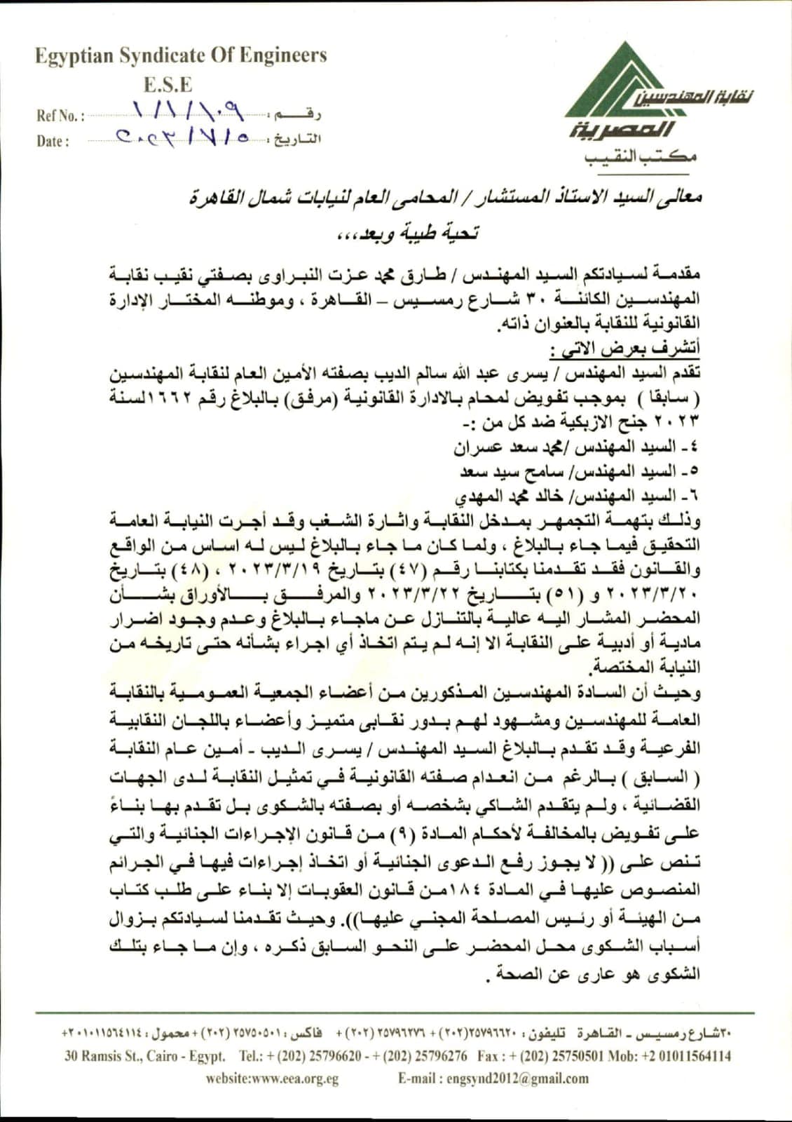 نقيب المهندسين يتقدم بطلب للتنازل عن بلاغات ضد مهندسين للمحامي العام