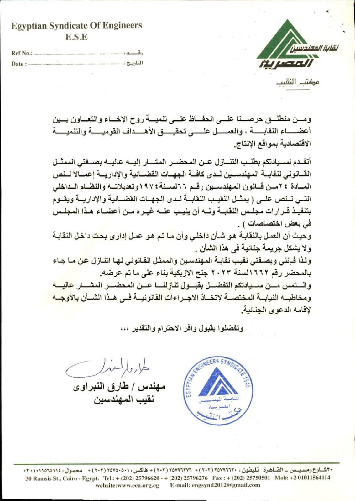 تقدم طارق النبراوي نقيب المهندسين، بطلب إلى السيد المستشار المحامي العام لنيابات شمال القاهرة، للتنازل عن المحضر الذي تقدم به الأمين العام السابق ضد ثلاثة من الزملاء المهندسين.