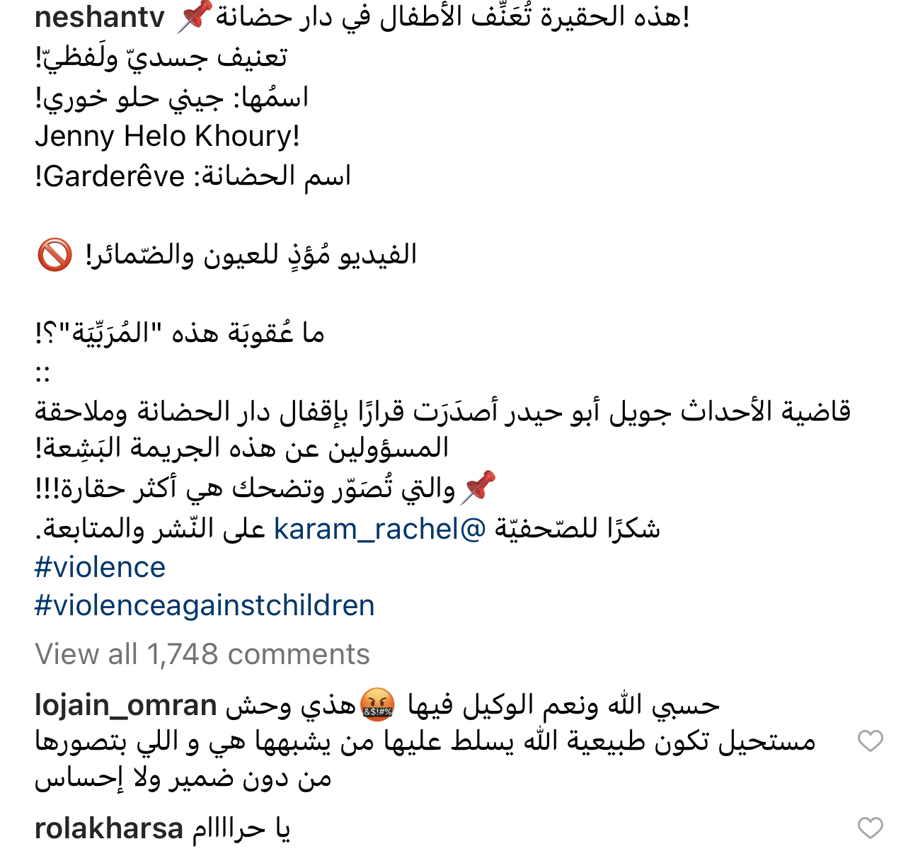 وقال نيشان، هذه الحقيرة تعنف الأطفال تعنيف جسدي ولفظي داخل الحضانة ما عقوبة هذه المربية، موضحا أن الجهات اللبنانية قامت بغلق الحضانة وتلاحق المسئولين عنها ، وتفاعل معه عدد كبير من المشاهير ممن طالبوا بمعاقبة هذه السيدة على فعلتها