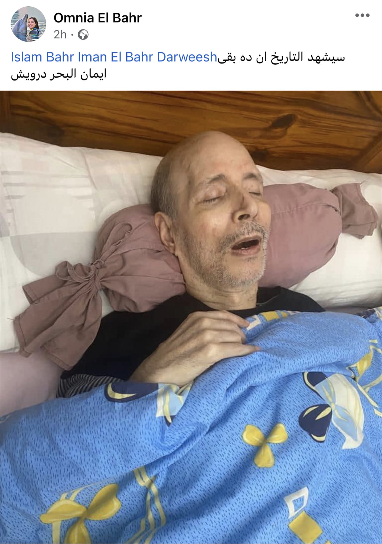 وكتبت أمنية ابنة ايمان البحر درويش ،"والنبي يا جماعة بلاش كل واحد فاضي ومش لاقي حاجة يعملها يدخل يكتب اعتقال ايمان البحر و فين ايمان البحر .. ابويا بخير و مش تحت سيطره حد و ماحدش معتقله .. و لكن هو في العناية المركزه علشان حصله انتكاسه .. فا بدل ما تضيعوا وقت في اي كلام ادعوله".