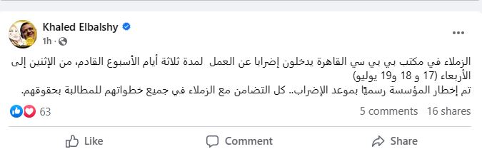 وكتب نقيب الصحفيين خلال منشور له عبر صفحته الرسمية "فيس بوك": "الزملاء في مكتب بي بي سي القاهرة يدخلون إضرابا عن العمل لمدة ثلاثة أيام الأسبوع القادم، من الاثنين إلى الأربعاء (17 و18 و19 يوليو)"، مضيفاً، "تم إخطار المؤسسة رسميًا بموعد الإضراب.. كل التضامن مع الزملاء في جميع خطواتهم للمطالبة بحقوقهم".
