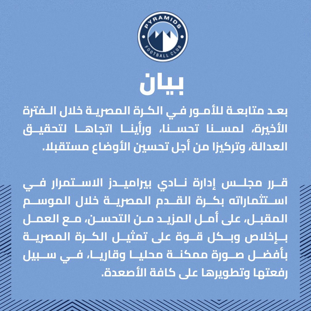 قرر مجلس إدارة نادي بيراميدز الاستمرار في استثماراته بكرة القدم المصرية خلال الموسم المقبل، على أمل المزيد من التحسن، مع العمل بإخلاص وبكل قوة على تمثيل الكرة المصرية بأفضل صورة ممكنة محليا وقاريا، في سبيل رفعتها وتطويرها على كافة الأصعدة.