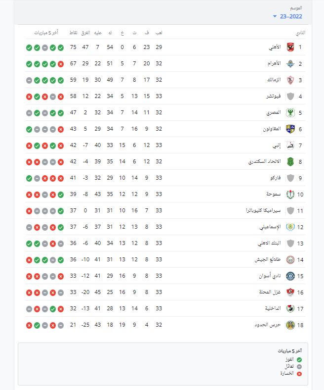 ترتيب الدوري المصري ..فيما يوجد فريق المقاولون العرب بالمركز الـ 6 برصيد 43 نقطة، جمعهم من 32 مباراة، فاز خلالها في 9 لقاءات وتعادل 6 مرات، وخسر في 14 مباراة.
