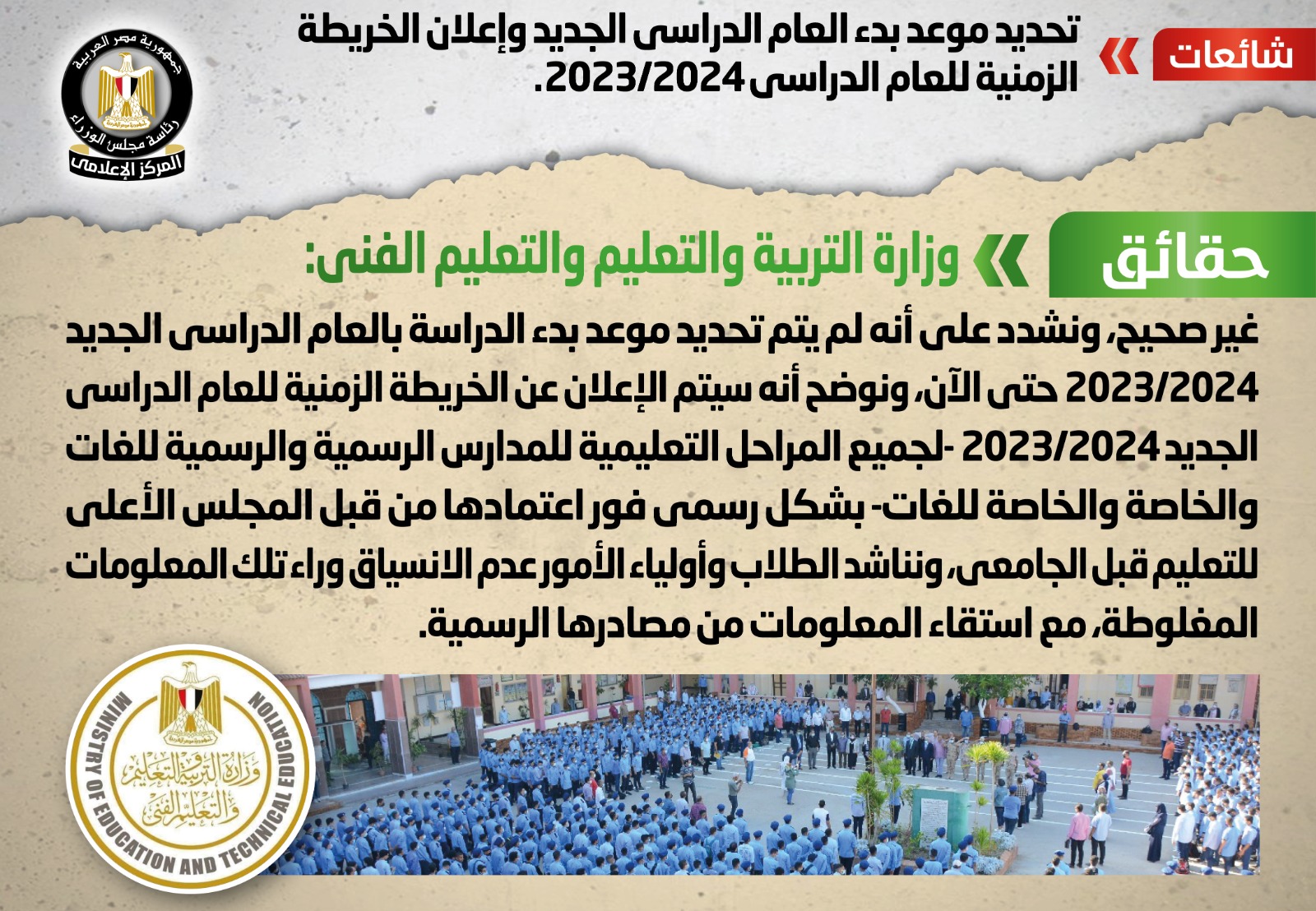 قام المركز الإعلامي لمجلس الوزراء بالتواصل مع وزارة التربية والتعليم والتعليم الفني، والتي نفت تلك الأنباء، مُؤكدةً أنه لا صحة لتحديد موعد بدء العام الدراسي الجديد وإعلان الخريطة الزمنية للعام الدراسي 2023/2024، مُشددةً على أنه لم يتم تحديد موعد بدء الدراسة بالعام الدراسي الجديد 2023/2024 حتى الآن، مُوضحةً أنه سيتم الإعلان عن الخريطة الزمنية للعام الدراسي الجديد 2023/2024 -لجميع المراحل التعليمية للمدارس الرسمية والرسمية للغات والخاصة والخاصة للغات- بشكل رسمي فور اعتمادها من قبل المجلس الأعلى للتعليم قبل الجامعي، مُناشدةً الطلاب وأولياء الأمور عدم الانسياق وراء تلك المعلومات المغلوطة، مع استقاء المعلومات من مصادرها الرسمية.