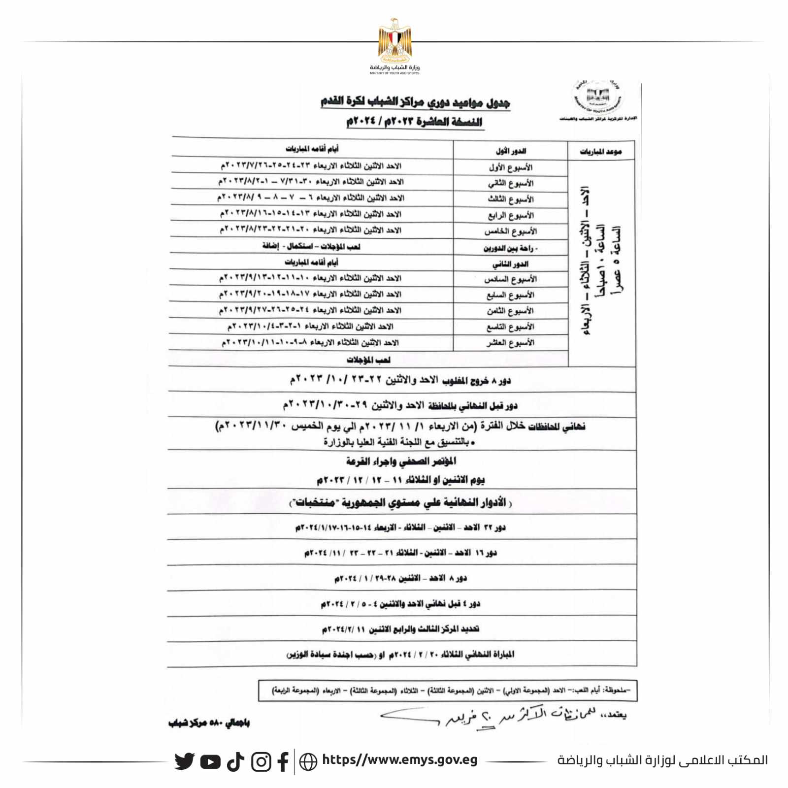 تحت رعاية السيد الرئيس عبد الفتاح السيسي، أعلنت اللجنة المنظمة لدوري مراكز الشباب بوزارة الشباب والرياضة من خلال الإدارة المركزية لمراكز الشباب والهيئات الشبابية، الإدارة العامة لأنشطة وفعاليات مراكز الشباب، بالتعاون مع شركة توتال انريجز، جدول دوري مراكز الشباب النسخة العاشرة بالكامل من بدايته 23 يوليو الجاري وحتي النهائي والذي يقام 20 فبراير 2024.