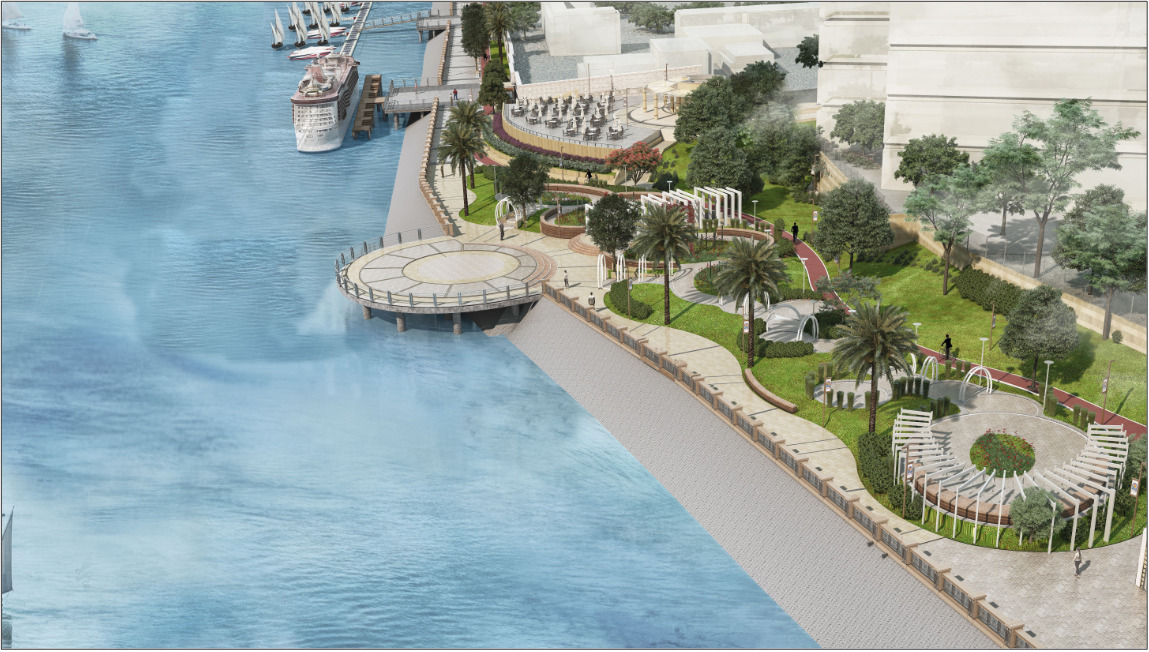 وأضاف الداودي أن التصميم يمثل مزيجا بين العناصـر المـاديـة المصنوعة والطبيعة المرتبطة بوادي النيل الاخضر من خلال التداخل بين العناصر النباتية والارضيات او تـداخل العناصر المائية في الساحات او الامتداد بالساحات علي مياة النيل لاضفاء الجاذبية والاثارة ، كما يؤكـد التصميم علـي هويـة المجتمع المحلـي وثقافته المحلية من خلال توفير معرض دائم لاهم المنتجات اليدوية والتقليدية التي تشتهر بها قنا مع توفير الساحات ومناطق التنزه والترفيه وإقامة المناسبات والاحتفالات.