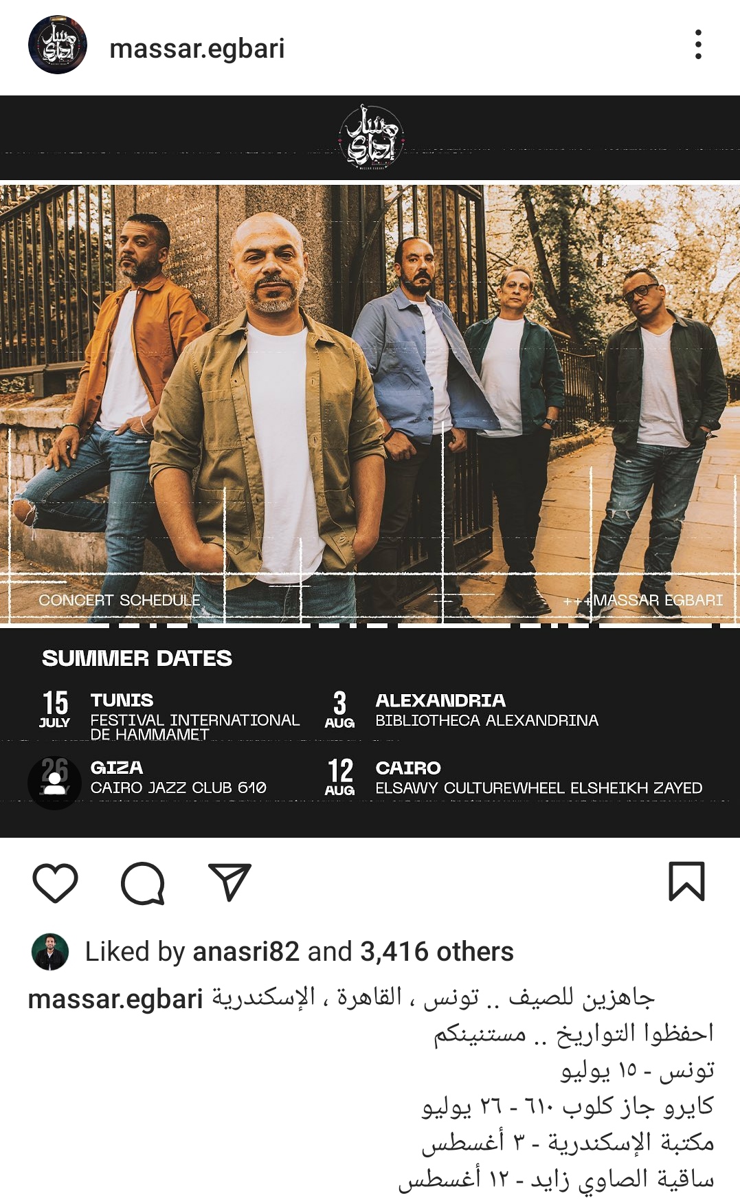 وتحيي مسار إجباري حفلًا في تونس يوم 15 يوليو الجاري، كما تحيي في كايرو جاز كلوب ٦١٠ يوم ٢٦ يوليو الحالي.