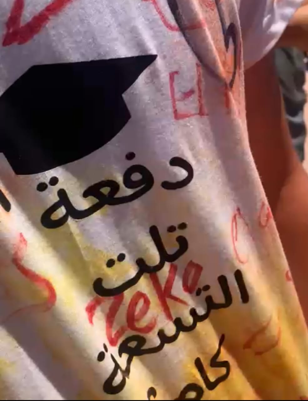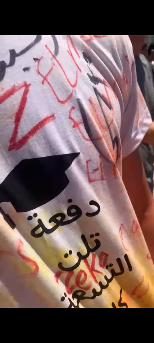 وارتدي الطالب تشيرت مكتوب عليه "تلت التسعة كام"، وحرص زملائه من الطلاب علي التوقيع باسمائهم علي التيشرت، وذلك وسط تساؤلات من المواطنون المتواجدون بميدان الإحتفال عن سر العبارة المكتوبة.