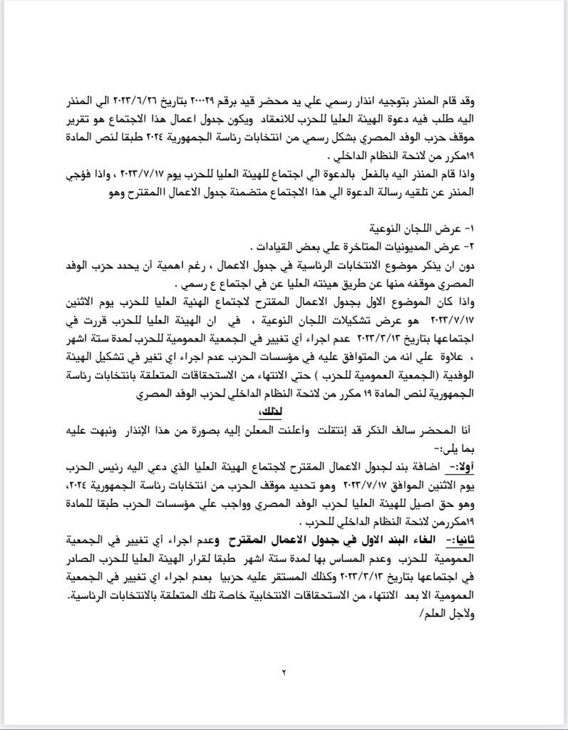 طالب بدراوي في الإنذار بإضافة بند لجدول الأعمال المقترح لاجتماع الهيئة العليا الذي دعا إليه رئيس الحزب يوم الإثنين القادم الموافق 17 يوليو 2023 البند الذي طلب بدراوي إضافته هو تحديد موقف الحزب من انتخابات رئاسة الجمهورية 2024 وهو حق أصيل للهيئة العليا لحزب الوفد المصري طبقا للمادة 19 مكرر من لائحة النظام الداخلي للحزب.