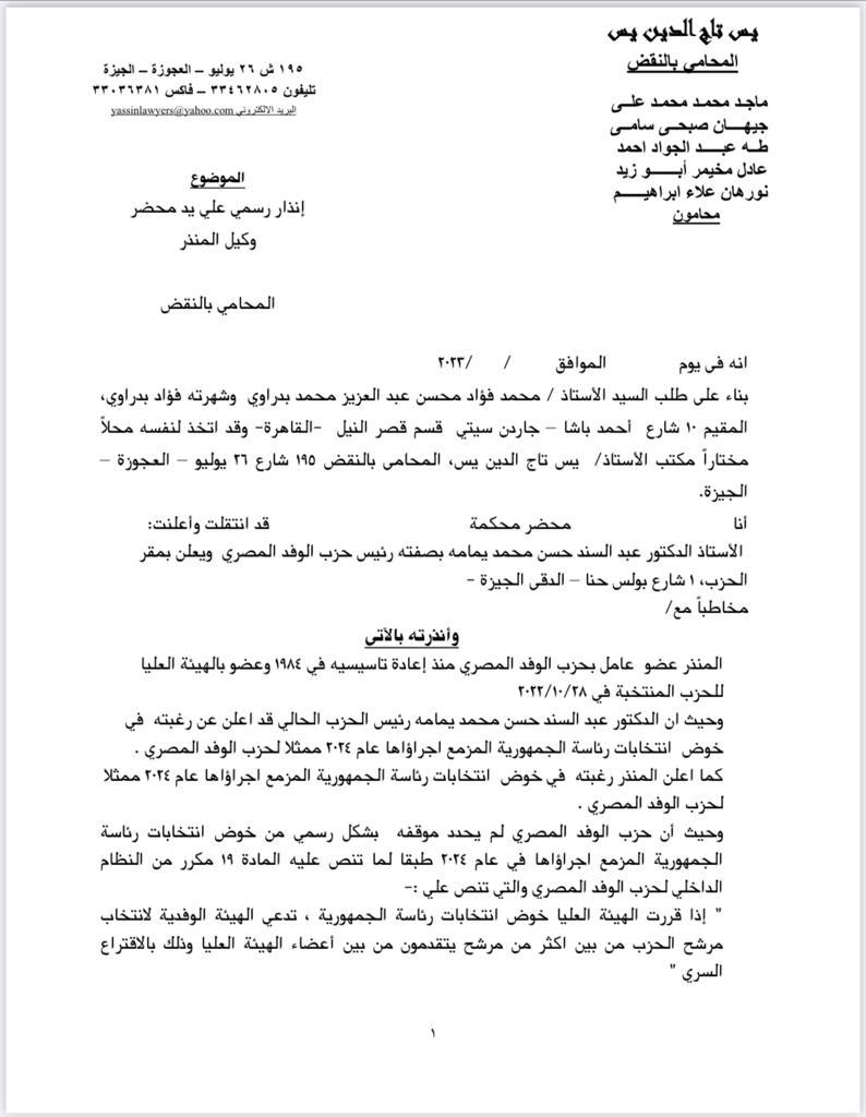 أرسل المرشح الرئاسي المحتمل وعضو الهيئة العليا لحزب الوفد فؤاد بدراوي إنذاراً رسمياً جديداً رقم 21067 بتاريخ 12 يوليو 2023 على يد مُحضر لرئيس حزب الوفد عبد السند يمامة منافسه على تمثيل الوفد في انتخابات رئاسة الجمهورية .