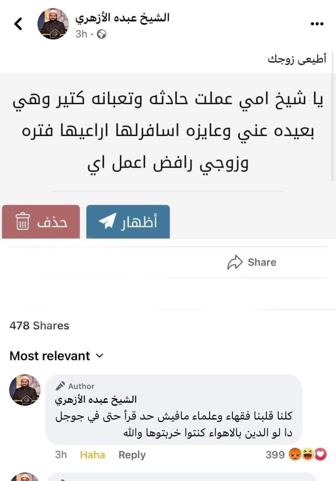 أثار أحد الشيوخ واسمه الشيخ عبده الأزهري على مواقع التواصل الاجتماعي جدلا كبير بعد أن طلب من سيدة طاعة زوجها الذي رفضأن تذهب زوجته لرعاية والدتها بعد تعرضها لحادث كبير وقال لها " أطيعي زوجك".