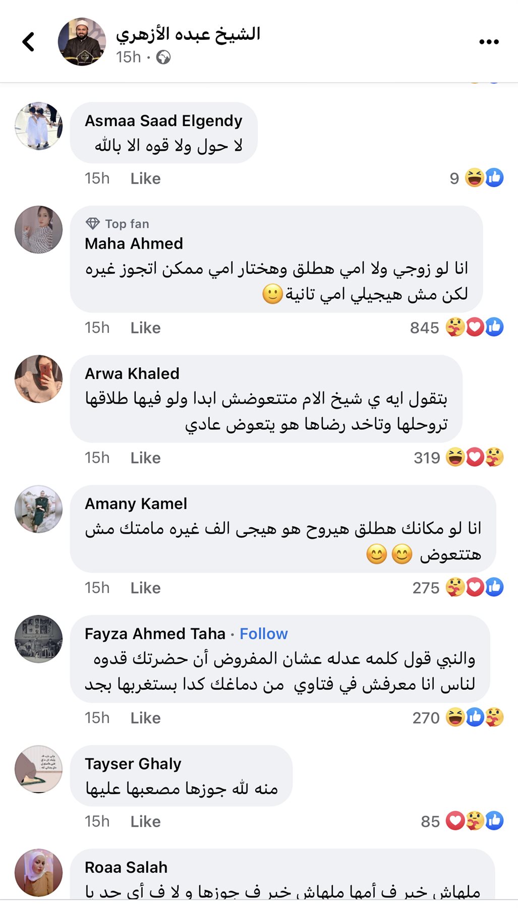 وهاجمه عدد كبير من المتابعين ، " بتقول ايه ي شيخ الام متتعوضش ابدا ولو فيها طلاقها تروحلها وتاخد رضاها هو يتعوض عادي"، وجاءتعليق آخر،" ملهاش خير ف أمها ملهاش خير ف جوزها و لا ف أي حد يا شيخنا"، وتابع تعليق آخر،" والنبي قول كلمه عدله عشانالمفروض أن حضرتك قدوه لناس انا معرفش في فتاوي من دماغك كدا بستغربها بجد".