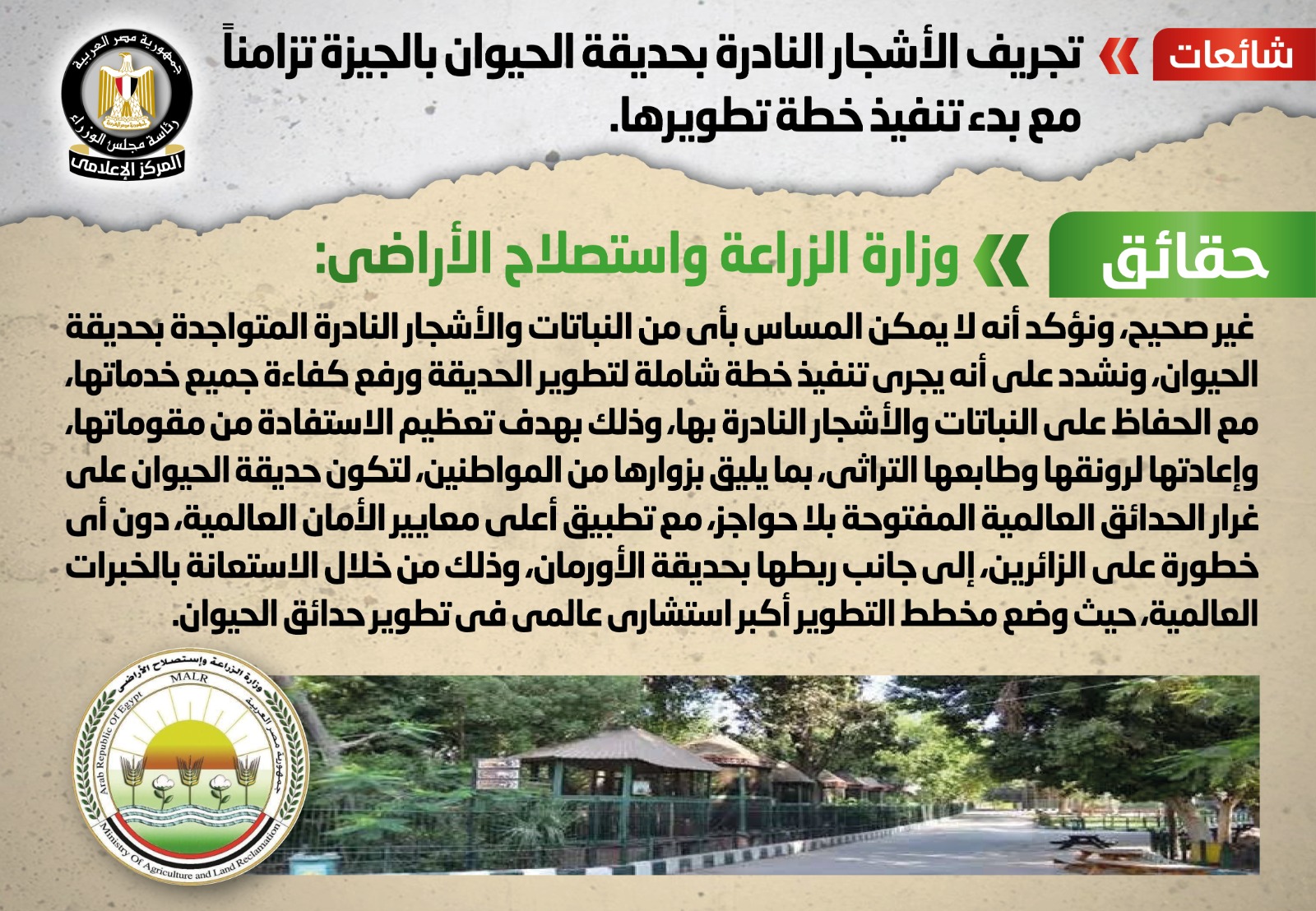 قام المركز الإعلامي لمجلس الوزراء بالتواصل مع وزارة الزراعة واستصلاح الأراضي، والتي نفت تلك الأنباء، مُؤكدةً أنه لا صحة لتجريف الأشجار النادرة بحديقة الحيوان بالجيزة تزامناً مع بدء تنفيذ خطة تطويرها، وأنه لا يمكن المساس بأي من النباتات والأشجار النادرة المتواجدة بحديقة الحيوان، مُشددةً على أنه يجري تنفيذ خطة شاملة لتطوير الحديقة ورفع كفاءة جميع خدماتها، مع الحفاظ على النباتات والأشجار النادرة بها، وذلك بهدف تعظيم الاستفادة من مقوماتها، وإعادتها لرونقها وطابعها التراثي، بما يليق بزوارها من المواطنين، لتكون حديقة الحيوان على غرار الحدائق العالمية المفتوحة بلا حواجز، مع تطبيق أعلى معايير الأمان العالمية، دون أي خطورة على الزائرين، إلى جانب ربطها بحديقة الأورمان، وذلك من خلال الاستعانة بالخبرات العالمية، حيث وضع مخطط التطوير أكبر استشاري عالمي في تطوير حدائق الحيوان.