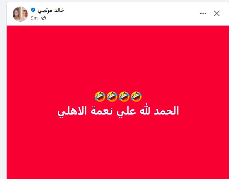 ونشر خالد مرتجي صورته وهو يضحك عبر حسابه الشخصي على موقع التواصل الاجتماعي "فيس بوك"، وعلق عليها: "الحمد لله على نعمة الأهلي".