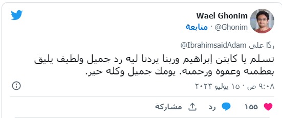 ورد عليه وائل غنيم قائلا: "تسلم يا كابتن إبراهيم وربنا يردنا ليه رد جميل ولطيف يليق بعظمته وعفوه ورحمته. يومك جميل وكله خير".