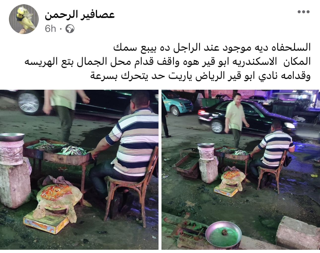 استغاث أحد المواطنين بوزارة البيئة لإنقاذ سلحفاة نادرة مع أحد البائعين فى الإسكندرية قائلا،" السلحفاه ديه موجود عند الراجل ده بيبع سمك المكان الاسكندريه ابو قير هوه واقف قدام محل الجمال بتع الهريسه وقدامه نادي ابو قير الرياض ياريت حد يتحرك بسرعة".