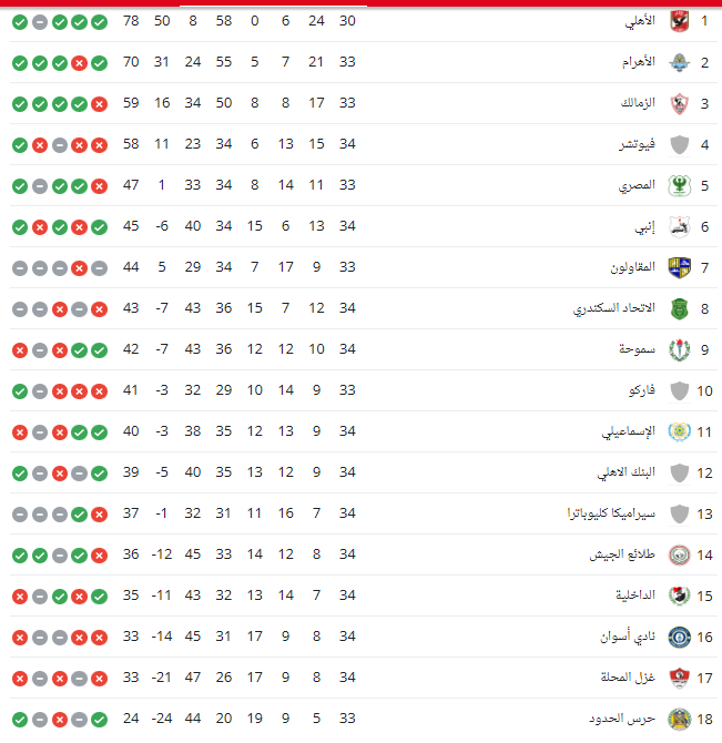 ترتيب الدوري المصري الممتاز بعد انتهاء الجوله الـ34