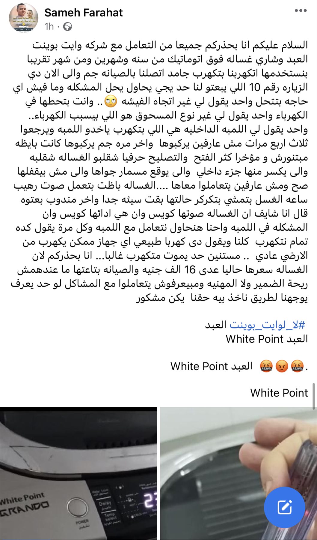 حذرت سيدة من شراء غسالات شركة وايت بوينت العبد ، مستعرضه تجربتها، قائلة،"السلام عليكم انا بحذركم جميعا من التعامل مع شركه وايت بوينت العبد وشاري غساله فوق اتوماتيك من سنه وشهرين ومن شهر تقريبا بنستخدمها اتكهربنا بتكهرب جامد اتصلنا بالصيانه جموالى الان دي الزياره رقم 10 اللي يبعتو لنا حد يجي يحاول يحل المشكله وما فيش اي حاجه بتتحل واحد يقول لي غير اتجاه الفيشه .. وانت بتحطها في الكهرباء واحد يقول لي غير نوع المسحوق هو اللي بيسبب الكهرباء".