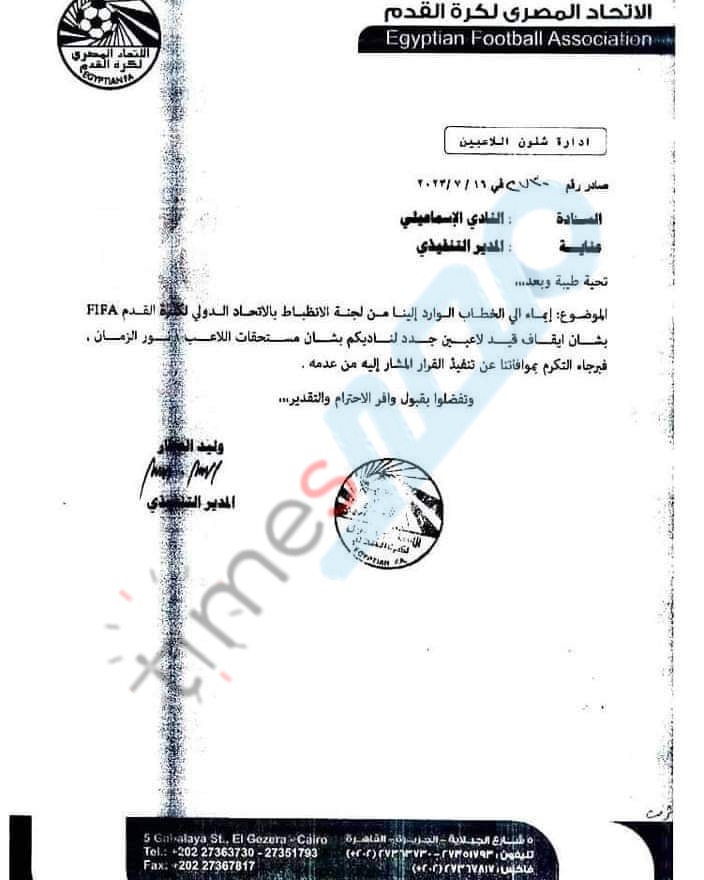 وقال اتحاد الكرة في خطابه إلى الإسماعيلي، إن لجنة الانضباط بالاتحاد الدولي لكرة القدم فيفا، أرسل خطابًا بشأن إيقاف قيد لاعبين جدد للنادي، بسبب اللاعب التونسي نور الزمان الزموري .