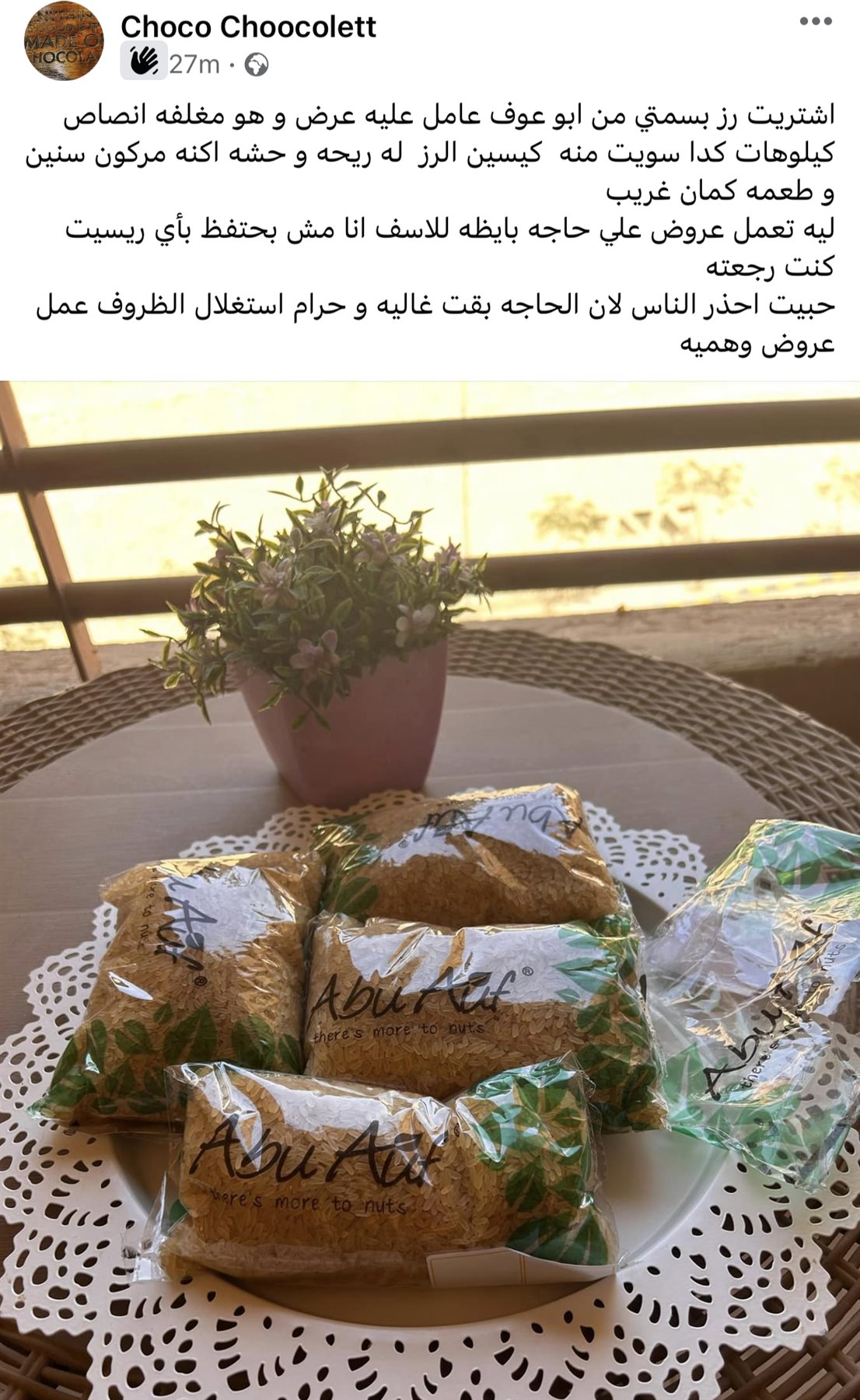 وقالت السيدة صاحبة الشكوي عن عروض ابو عوف الوهمية ،" اشتريت رز بسمتي من ابو عوف عامل عليه عرض و هو مغلفه انصاص كيلوهات كدا سويت منه كيسين الرز له ريحه و حشه اكنه مركون سنين و طعمه كمان غريب".
