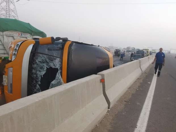 وتلقى مرفق الإسعاف، إخطارًا بوقوع حادث انقلاب أتوبيس يحمل لوحات معدنية «ي.ف.ج 325»، على الطريق الصحراوي الشرقي في المنطقة الواقعة بين أطفيح الكريمات في اتجاه محافظة بني سويف، ما نتج عنه إصابة 16 راكبا بإصابات متفرقة، وجرى التوجيه بانتقال سيارات الإسعاف ونقل المصابين إلى أقرب مستشفى.