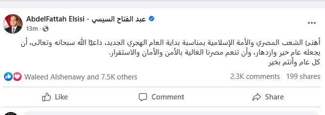الرئيس السيسي يهنئ الشعب المصرى بمناسبة العام الهجرى الجديد