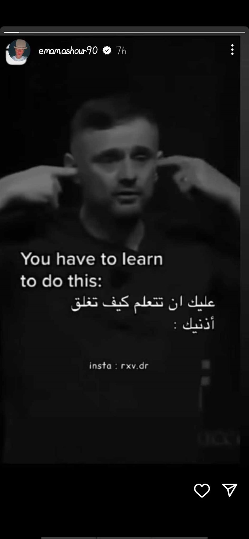 ونشر إمام عاشور عبر صفحته على موقع التواصل الإجتماعي "إنستجرام" فيديو خلال تقنية ستوري، وتضمن الفيديو: "عليك أن تغلق أذنيك، هذا هو سر سعادتى، أنا سعيد للغاية لأننى لا أستطيع سماع أى شىء، عندما تتوقف عن الإنصات لآراء الناس ستصبح حياتك مبهرة".