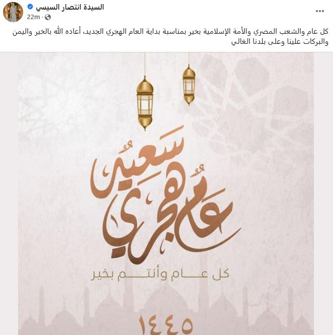 وقالت انتصار السيسي في تدوينة على صفحتها الرسمية على مواقع التواصل الاجتماعي "كل عام والشعب المصري والأمة الإسلامية بخير بمناسبة بداية العام الهجري الجديد، أعاده الله بالخير واليمن والبركات علينا وعلى بلدنا الغالي".