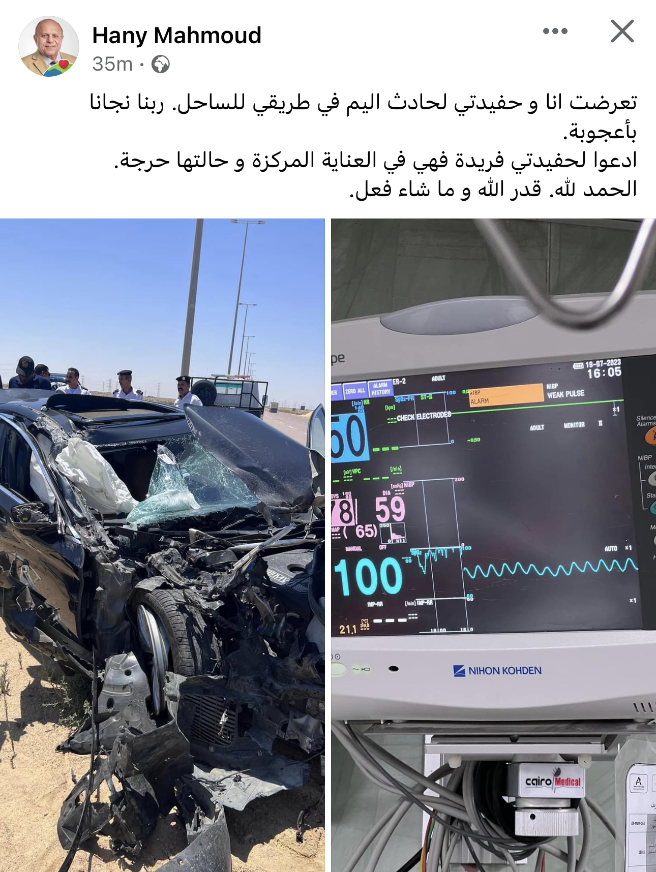 وقال عبر صفحته ،" تعرضت انا و حفيدتي لحادث اليم في طريقي للساحل. ربنا نجانا بأعجوبة..ادعوا لحفيدتي فريدة فهي في العناية المركزة و حالتها حرجة..الحمد لله. قدر الله و ما شاء فعل".