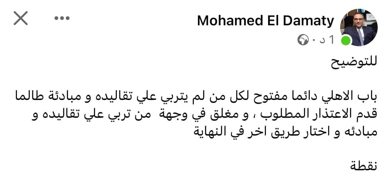وكتب محمد الدماطي عبر صفحته بموقع "فيس بوك"، للتوضيح باب الاهلي دائما مفتوح لكل من لم يتربي علي تقاليده ومبادئه طالما قدم الاعتذار المطلوب (في إشارة إلى التعاقد مع إمام عاشور)، ومغلق في وجهة من تربي علي تقاليده و مبادئه و اختار طريق اخر في النهاية".