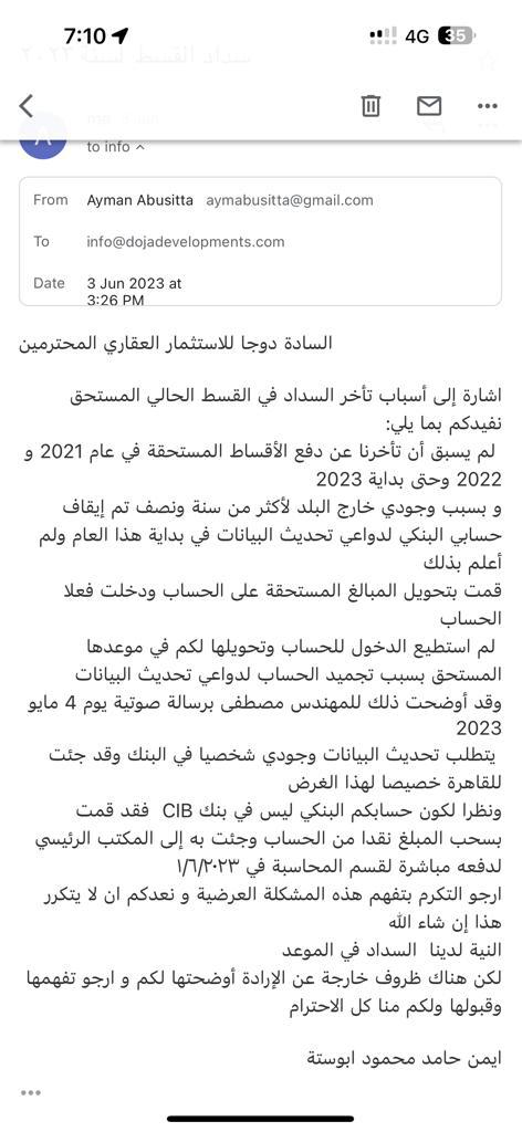 استغاث مواطن يدعي أيمن حامد ، من شركة دوچا للتطوير العقاري بعد موقف الشركة غير المبرر من فسخ التعاقد معه لمجرد تحديث البنك الخاص بالعميل لبياناته.