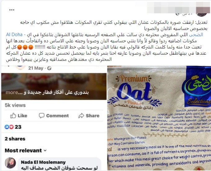 وقالت صاحبة الواقعة ،" للي المفروض محترمه دي سالت علي الصفحه الرسميه بتاعتها الشوفان بتاعكوا في اي مكونات اضافيه ردوا وقالو لأ وانا بنتي حساسيه البان وصويا وجبته علي الاساس ده واتفاجأت بعدها انها تعبت جدا منه ولما كلمت الشركه قالولي فيه بقايا البان وصويا علي خط الانتاج بتاعه !!!!!!!! كل ام عندها في بيتهاطفل حساسيه البان وصويا عارفه احنا بنمر بايه لما بيحصل تحسس شديد كل ده عشان الشركه المحترمه دي معندهاش مصداقيه وعايزين يبيعوا وخلاص".