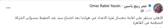 و كتب عمر ربيع ياسين عبر حسابة الشخصي "فيس بوك": "الاهلي يستقر على إقامة معسكر فترة الإعداد في هولندا بعد اجتماع سيد عبد الحفيظ بمسئولي الشركة المنظمة في القاهرة".