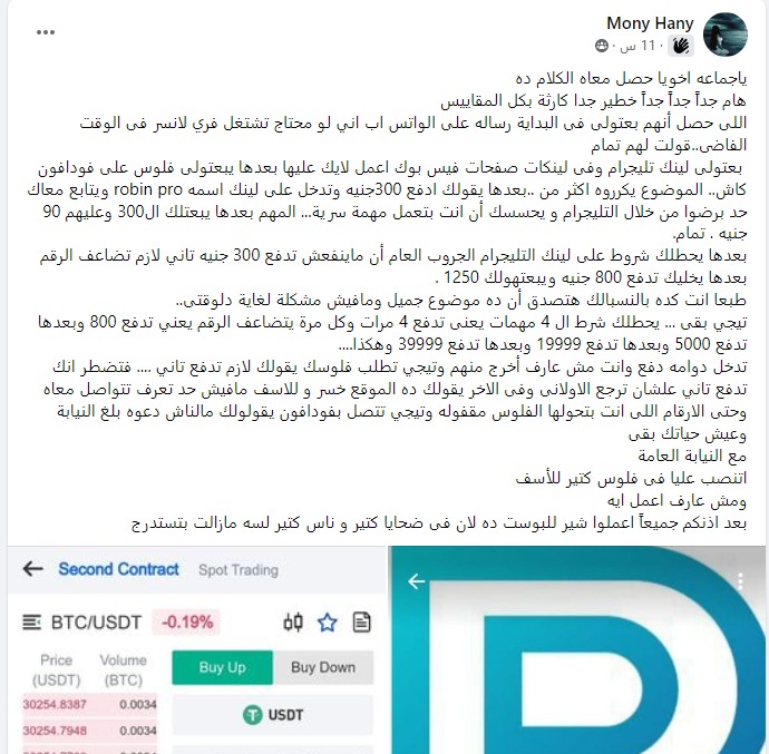 حذرت فتاة تسمي "موني هاني" من وسيلة جديدة لخداع المصريين وسرقة أموالهم على طريقة النصب مؤخرا لمنصة "هوج بول"، وقال صاحب الواقعة،" ياجماعه اخويا حصل معاه الكلام ده هام جداً جداً جداً خطير جدا كارثة بكل المقاييس اللى حصل أنهم بعتولى فى البداية رساله على الواتس اب اني لو محتاج تشتغل فري لانسر فى الوقت الفاضى..قولت لهم تمام بعتولى لينك تليجرام وفى لينكات صفحات فيس بوك اعمل لايك عليها بعدها يبعتولى فلوس على فودافون كاش.. الموضوع يكرروه اكثر من ..بعدها يقولك ادفع 300جنيه وتدخل على لينك اسمه robin pro ويتابع معاك حد برضوا من خلال التليجرام و يحسسك أن انت بتعمل مهمة سرية... المهم بعدها يبعتلك ال300 وعليهم 90 جنيه . تمام".