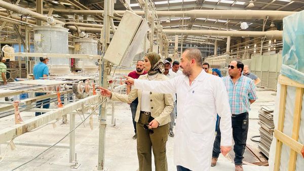 كما زارت المهندسة أسماء مخلوف، شركة مصر/إسبانيا لإنتاج السيراميك والبورسلين بمنطقة التوسعات بعتاقة، والذي يمتد على مساحة 40760٠م2 بطاقة إنتاجية تصل إلى 30 ألف م/يوم، ومن المستهدف أن تزيد إلى 40 ألف م/يوم خلال 6 أشهر بأكثر من علامة تجارية وتصدر 15٪ من الإنتاج ويتميز المصنع بمعالجته لجميع كميات مياه الصرف الناتجة ليعاد استخدامها في مجال الصناعة.