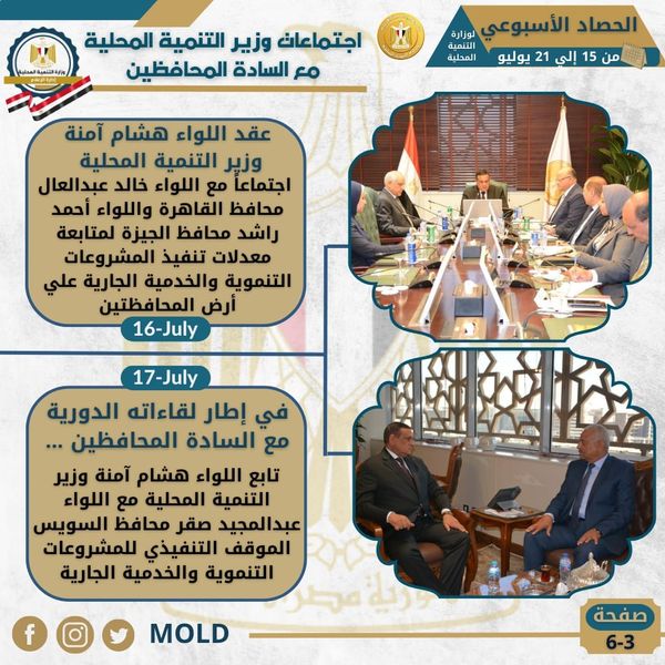 كما عقد اللواء هشام آمنة وزير التنمية المحلية، اجتماعاً مع اللواء خالد عبدالعال محافظ القاهرة واللواء أحمد راشد محافظ الجيزة وعدد من قيادات الوزارة والمحافظتين وذلك بمقر وزارة التنمية المحلية بالحي الحكومي بالعاصمة الادارية الجديدة، لمتابعة معدلات تنفيذ المشروعات التنموية والخدمية الجارية علي أرض المحافظتين في إطار توجيهات الرئيس عبد الفتاح السيسي وتكليفات رئيس مجلس الوزراء فيما يخص عدد من الملفات المهمة التى تمس حياة المواطنين .