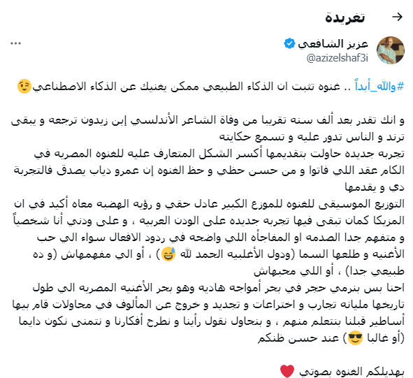 وعلق عزيز الشافعي قائلًا: "والله أبدًا.. غنوة تثبت أن الذكاء الطبيعي ممكن يغنيك عن الذكاء الاصطناعي وإنك تقدر بعد ألف سنة تقريبًا من وفاة الشاعر الأندلسي ابن زيدون ترجعه ويبقى تريند والناس تدور عليه وتسمع حكايته تجربة جديدة حاولت بتقديمها أكسر الشكل المتعارف عليه للغنوة المصرية في الكام عقد اللي فاتوا".
