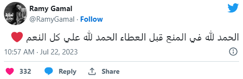 شارك الفنان رامي جمال، منشوراً عبر حسابه الشخصي على موقع التدوينات القصيرة "تويتر" وكتب: "الحمد لله في المنع قبل العطاء الحمد لله علي كل النعم"، وذلك بعد تصريحاته بأن لديه مشكلة في الإنجاب، وأمنيته أن يصبح أبًا.