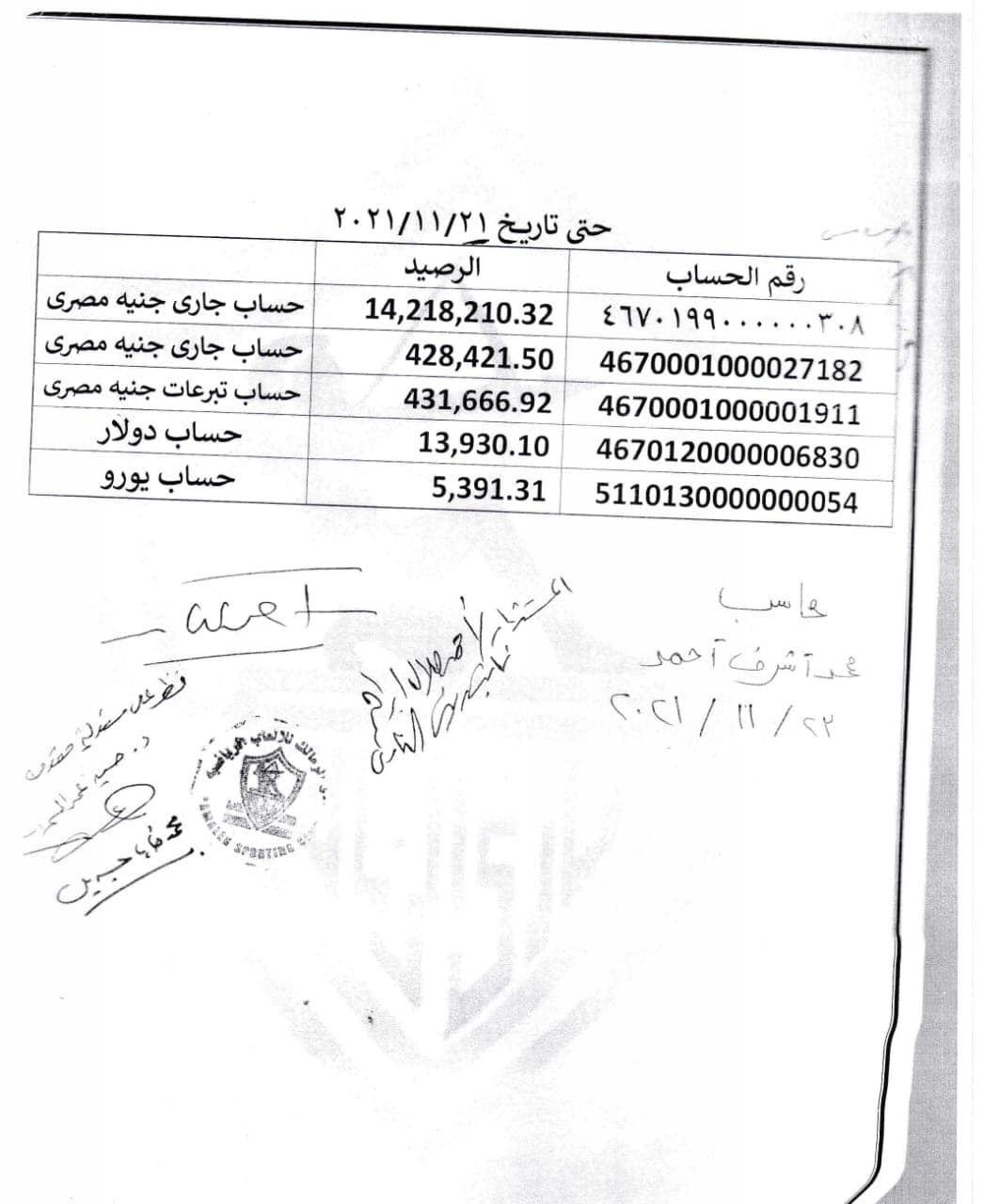 وأضاف: “ وما أثير حول وجود مبلغ 69000 جنيه فقط هي كل السيولة المتوفره ويأتي هذا علي عكس ماجاء رسميا في محاضر التسليم والإستلام المذيلة بتوقيعات أعضاء لجنة الإستلام وممهوره بالأختام أيضا والتي أفادت بوجود ما فاق 14 مليون جنيه مصري مابين خزينة النادي وحسابات البنوك والتي لم يكن محجوزا عليها في حينه”.