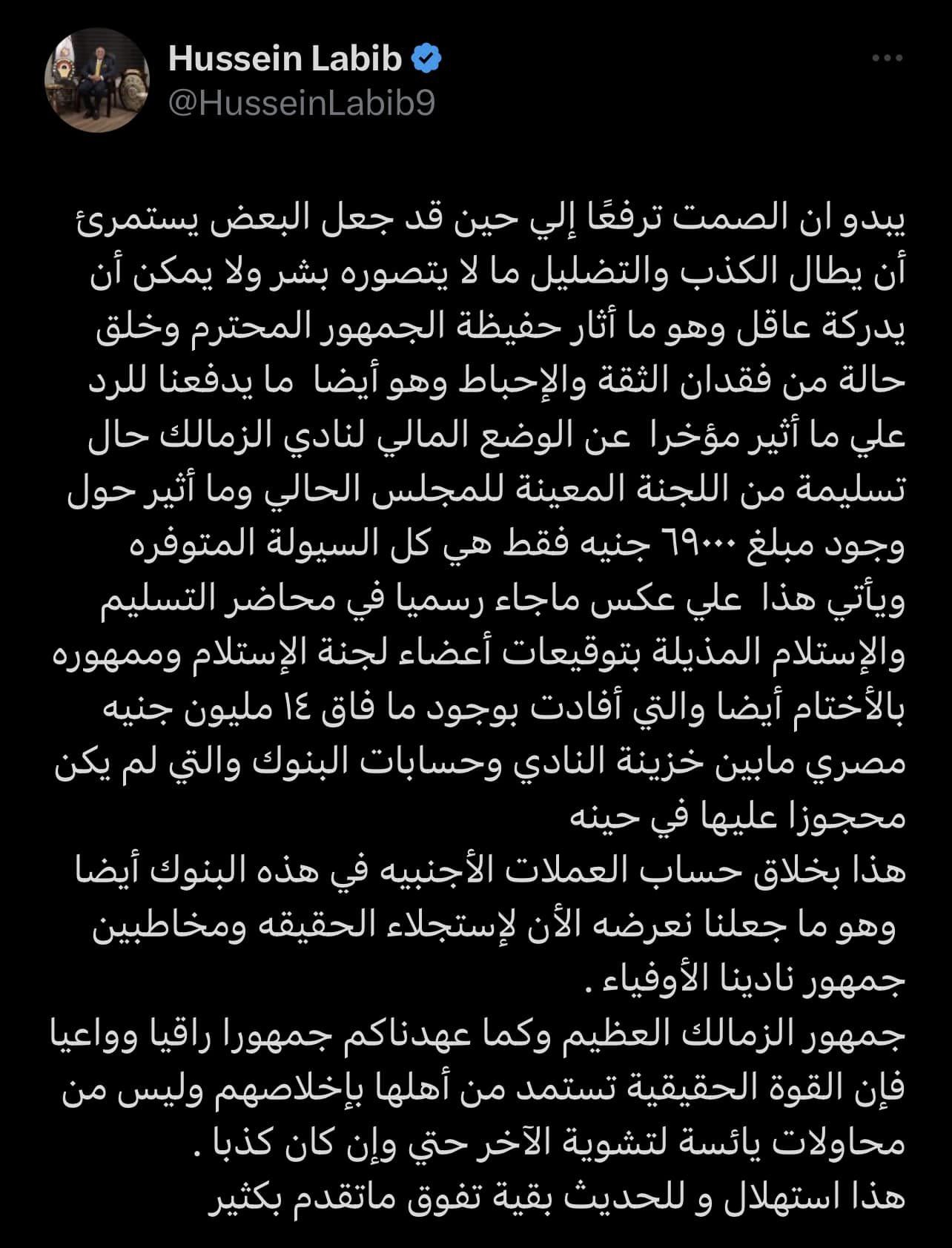 وقال حسين لبيب في بيان أصدره عبر صفحته الرسمية بموقع "فيس بوك"، يبدو ان الصمت ترفعًا إلي حين قد جعل البعض يستمرئ أن يطال الكذب والتضليل ما لا يتصوره بشر ولا يمكن أن يدركة عاقل وهو ما أثار حفيظة الجمهور المحترم وخلق حالة من فقدان الثقة والإحباط وهو أيضا ما يدفعنا للرد علي ما أثير مؤخرا عن الوضع المالي لنادي الزمالك حال تسليمة من اللجنة المعينة للمجلس الحالي".