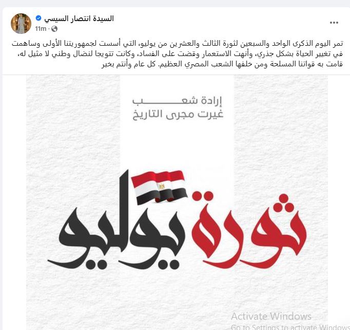 وقالت السيدة انتصار السيسي فى تدوينة على صفحتها الرسمية على مواقع التواصل الاجتماعي "تمر اليوم الذكرى الواحد والسبعين لثورة الثالث والعشرين من يوليو، التي أسست لجمهوريتنا الأولى وساهمت في تغيير الحياة بشكل جذري، وأنهت الاستعمار وقضت على الفساد، وكانت تتويجا لنضال وطني لا مثيل له قامت به قواتنا المسلحة ومن خلفها الشعب المصري العظيم.. كل عام وأنتم بخير".