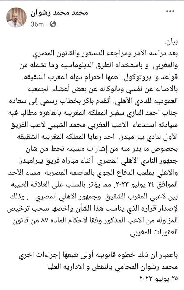 وأصدر محمد رشوان المحامي بالنقض والإدارية العليا، وعضو الجمعية العمومية بالنادي الأهلي ومحامي جمهور الأهلي، بيانا طالب فيه سفارة المغرب باستدعاء اللاعب.